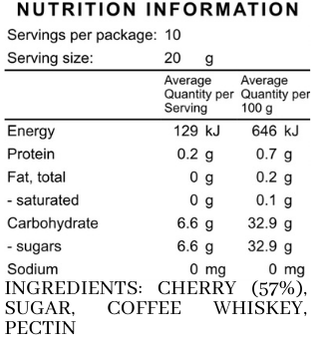 Get ready for a flavour explosion with our Cherry & Coffee Whiskey Jam! This bold blend of tart cherries and rich coffee whiskey is the perfect way to shake up your breakfast or dessert routine. Spread it on toast, slather it on yoghurt, or drizzle it over ice cream - however you use it, this jam is sure to bring that WOW factor to your meals.